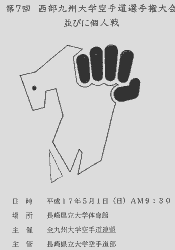 | 第7回西部九州大学選手権大会 並ぴに個入戦 日時:平成17年5月1日(日)AM9:・30 場所:長崎県立大学体育館 主催:全九州大学空手道連盟 主管:長崎県立大学空手道部 |