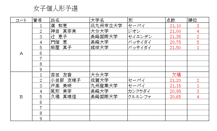 HOME 表紙 総合結果 個人形予選 個人形決勝 女子個人組手 男子個人組手 Excelleファイル