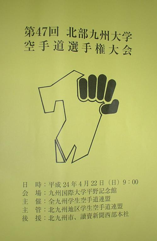 第47回北部九州大学空手道選手権大会 日時:平成24年4月22日(日)9:00 会場:九州国際大学平野記念館 主催:全九州学生空手道連盟 主管:北九州地区学生空手道連盟 後援:北九州市、読売新聞本社