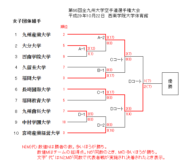 第66回全九州大学空手道選手権大会 日時:平成29年10月22日(日)9時10分開会 場所:西南学院大学 体育館 主催:全九州学生空手道連盟 主管:福岡地区学生空手道連盟 後援:公益財団法人全日本空手道連盟 九州地区空手道協議会 福岡県空手道連盟