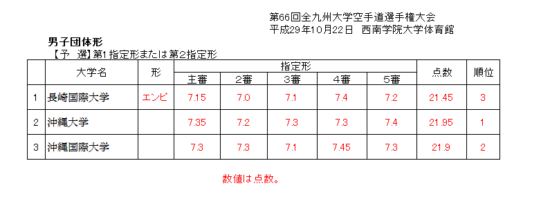 第66回全九州大学空手道選手権大会 日時:平成29年10月22日(日)9時10分開会 場所:西南学院大学 体育館 主催:全九州学生空手道連盟 主管:福岡地区学生空手道連盟 後援:公益財団法人全日本空手道連盟 九州地区空手道協議会 福岡県空手道連盟