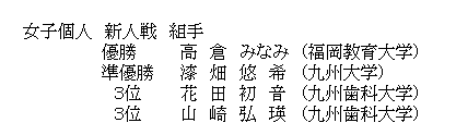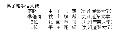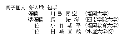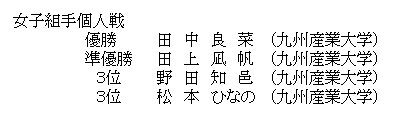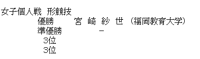 表紙   北部九州総合結果     男子個人新人戦  女子個人新人戦  女子個人形