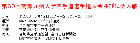 第60回南部九州大学空手道選手権大会並びに個人戦 平成30年5月12日 宮崎市KIRISHIMA つわぶき武道館