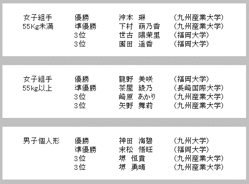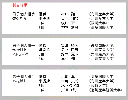 1_表紙 2_総合結果 3_男子個人形予選 4_女子個人形予選 5_男子個人形/女子個人形準決勝 6_男子/女子個人形3位決定戦/決勝戦 7_男子個人組手65kg未満 8_男子個人組手65kg以上75kg未満 9_男子個人組手75kg以上 10_女子個人組手55kg未満 11_女子個人組手55kg以上 PDFファイル Excelファイル 写真 戻る