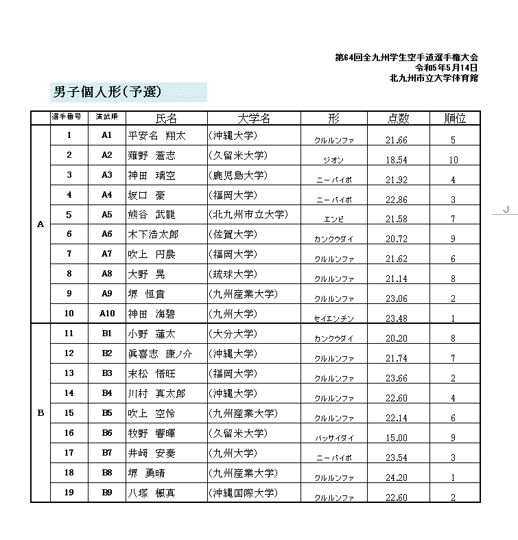 1_表紙 2_総合結果 3_男子個人形予選 4_女子個人形予選 5_男子個人形/女子個人形準決勝 6_男子/女子個人形3位決定戦/決勝戦 7_男子個人組手65kg未満 8_男子個人組手65kg以上75kg未満 9_男子個人組手75kg以上 10_女子個人組手55kg未満 11_女子個人組手55kg以上 PDFファイル Excelファイル 写真 戻る