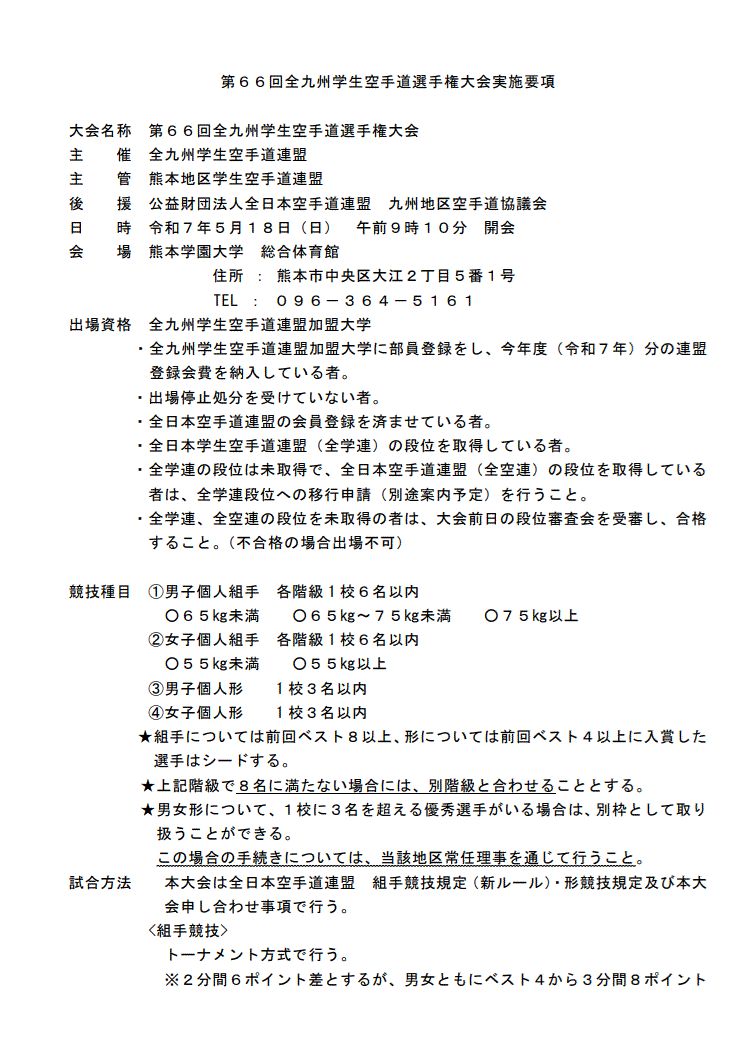 2025/05/18 第66回全九州学生空手道選手権大会の情報です。